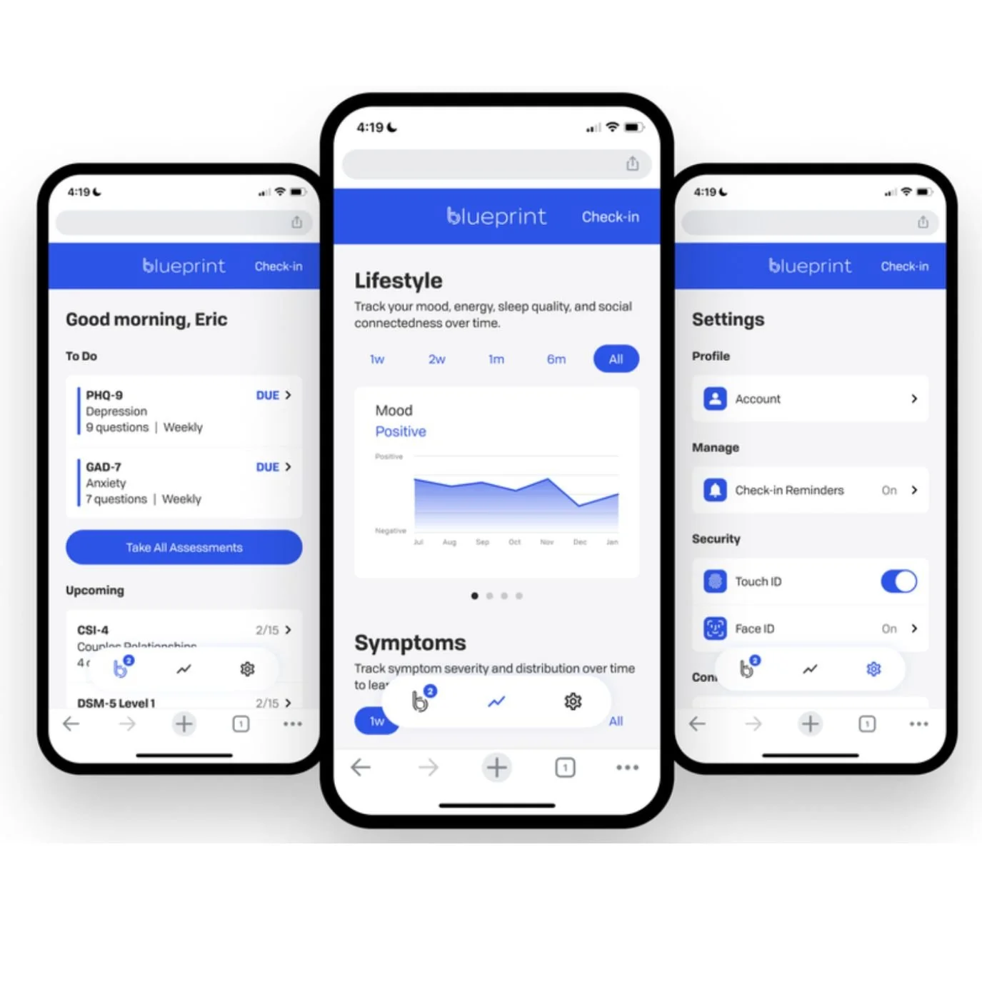 Blueprint is a digital service that allows our patients to complete assessments and submit therapist-monitored journals about their mental health in between sessions and on their own time via their phone or web browser.